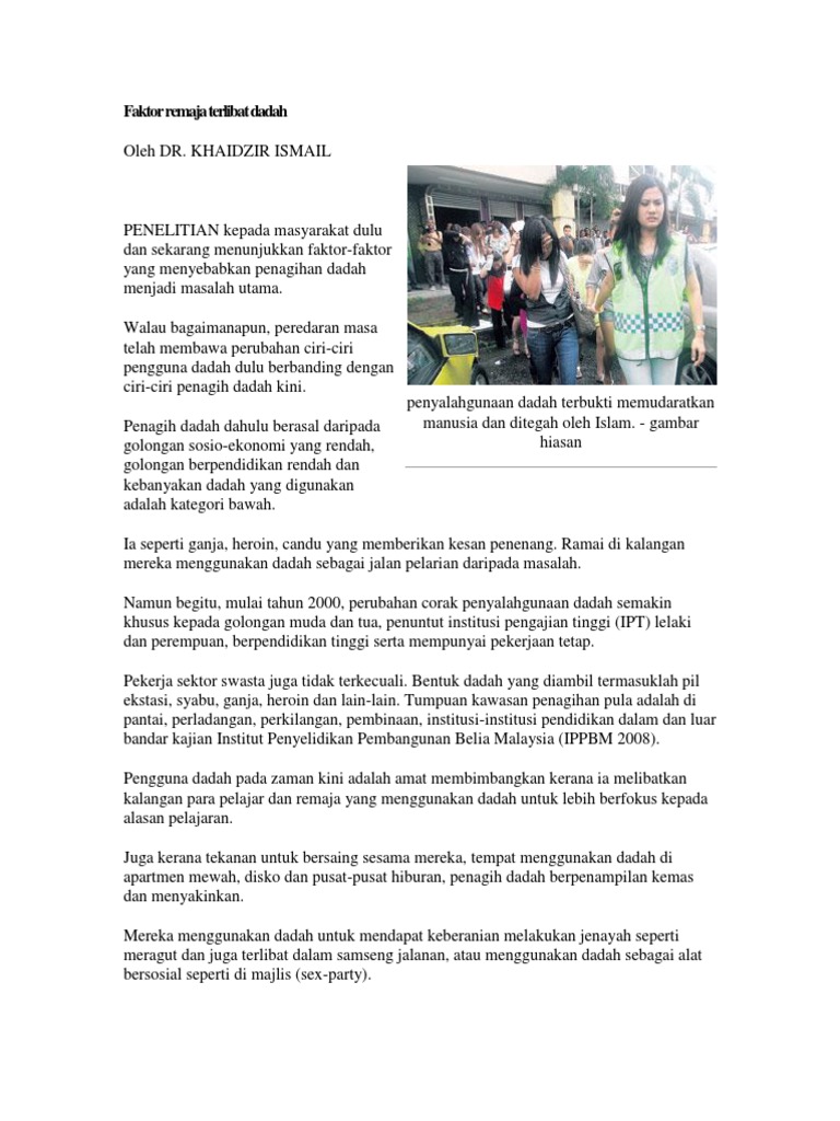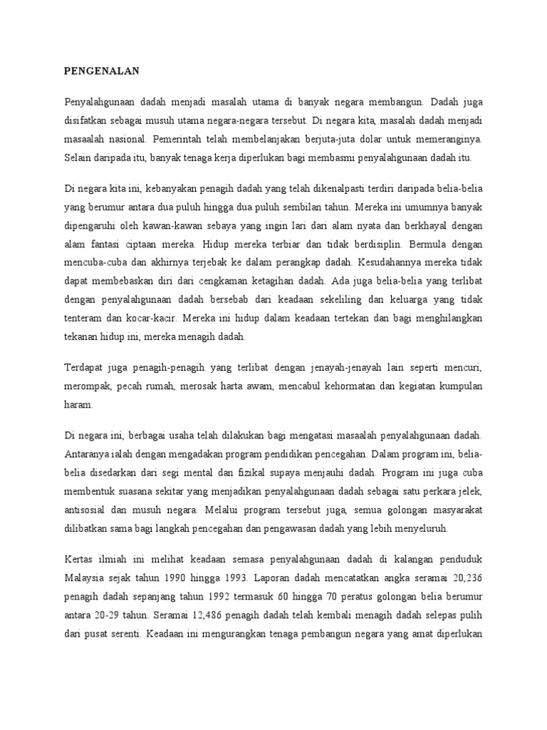 402 buah sekolah telah tersenarai sebagai sebagai sekolah hotspot dari seluruh negeri dalam malaysia. Dadah ini juga telah menular ke kawasan felda, sektor perkilangan dan para nelayan. Akta penyalahgunaan dadah yang pertama ialah akta berbahaya 1952. This paper begins by stating that drug abuse in the campus is a real but elusive problem. Penyalahgunaan dadah adalah isu yang rumit dan telah menjadi masalah kesihatan awam yang serius di malaysia.