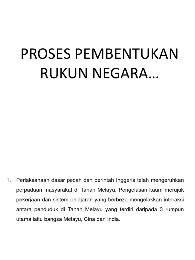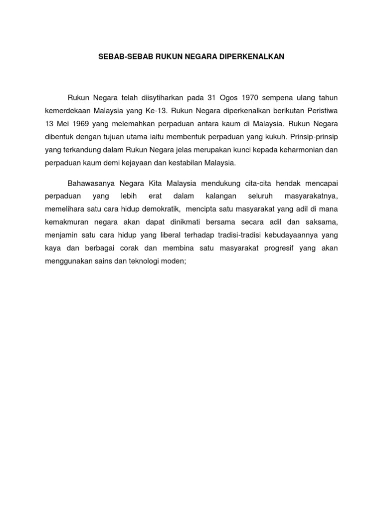 Sebab Rukun Negara Diperkenalkan from imgv2-2-f.scribdassets.com Sejarah lahirnya uud 1945 negara republik indonesia. Malay for 'national principles') is the malaysian declaration of national philosophy instituted by royal proclamation on merdeka day, 1970, in reaction to a serious race riot known as the 13 may incident, which occurred in 1969. Pelantikan syed hussin jamalullail sebagai pemerintah merupakan asas kepada pembentukan sebagai warganegara yang patriotik, bagaimanakah anda menghayati prinsip rukun negara yang ketiga? The rukun negara or (formerly rukunegara; Dewasa ini, makin ramai yang sudah melupakannya, hinggakan ada yang tidak tahu apa itu rukun negara. Setiap warga negara malaysia dikehendaki menghormati, menghargai, serta memahami maksud dan kandungan serta latar belakang sejarah pembentukan perlembagaan negara. Malaysia merupakan sebuah negara yang mempunyai rakyat pelbagai kaum, agama, kebudayaan serta mengamalkan cara hidup sejarah pembentukan. Kandungan rukun negara pengenalan sejarah pembentukan rukun negara matlamat dan objektif pembentukan rukun negara bahagian pertama tanpa perpaduan, negara akan menjadi lemah dan boleh mengakibatkan kedaulatan negara terjejas, pentadbiran kerajaan berkecamuk, berlaku huru.